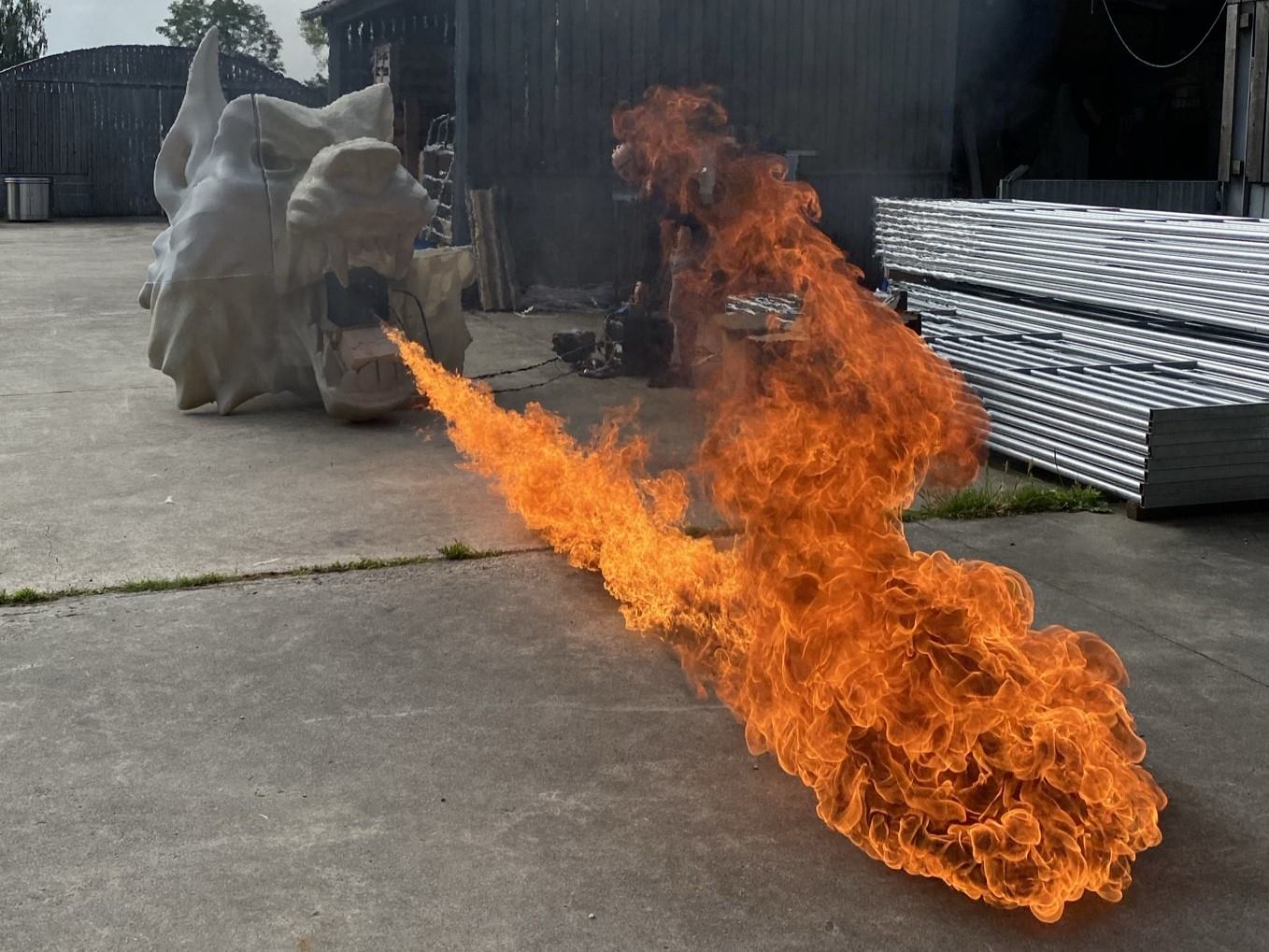 After the 3D printing phase, each segment of the wolf head was meticulously coated with a fiberglas resin to reinforce the 3D print and a fire-retardant layer to ensure it could handle the intensity of live pyrotechnics. The fireproofing process added a layer of safety, critical for an installation that would endure the heat of the flames during performances. FX³ then conducted flame tests to verify the material’s resilience and fine-tune the placement of the flamethrowers. The wolf heads passed these rigorous tests, proving both their durability and their readiness for the thrilling displays that awaited.